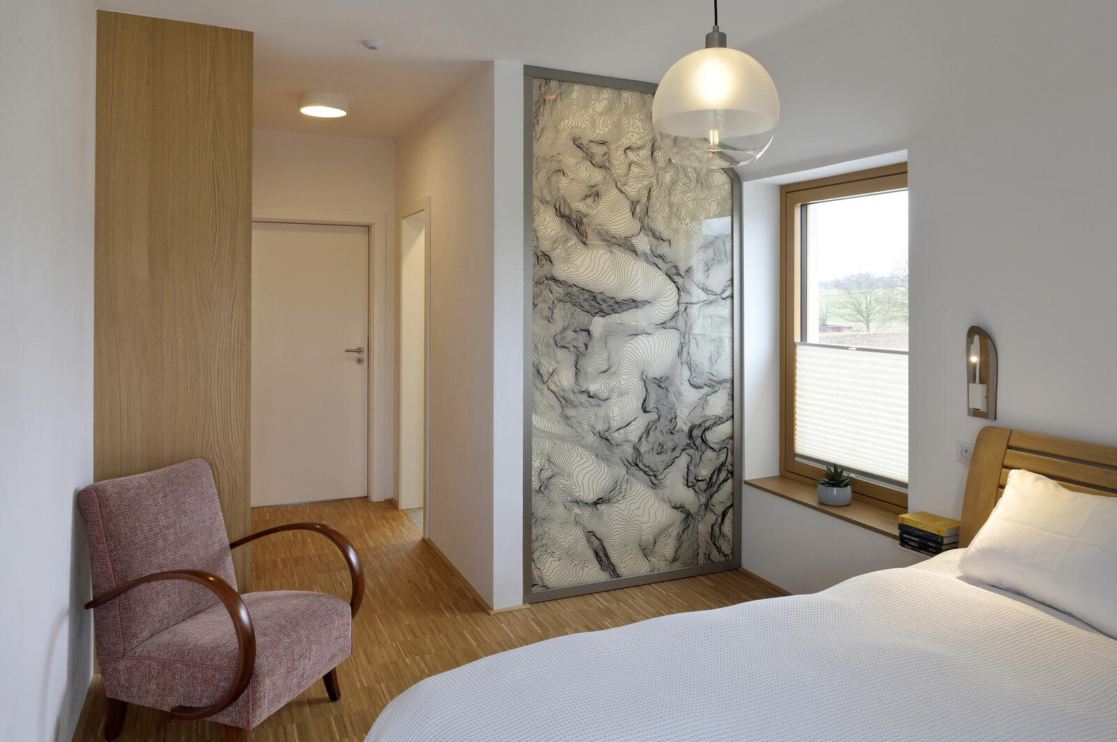 „Обмисляхме как по фин и същевременно интересен начин да свържем стената на банята в зоната на душа със спалнята. Обичаме да внасяме в интериора си елементи от класически материали с непреходни собствени детайли.
